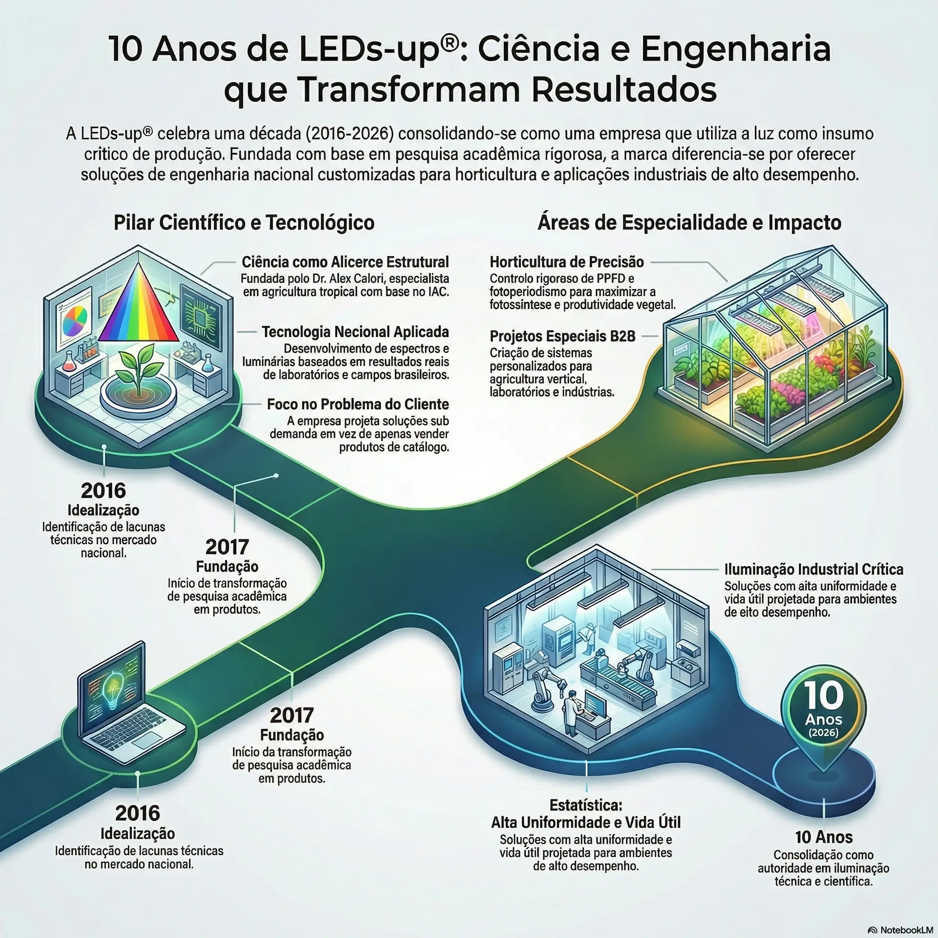 Inspirada em 2016, e fundada em 2017, a LEDs-up® chega a 2026 com uma década de trajetória sólida, projetos técnicos especializados e soluções de iluminação LED desenvolvidas para quem trata a luz como fator crítico de produção.