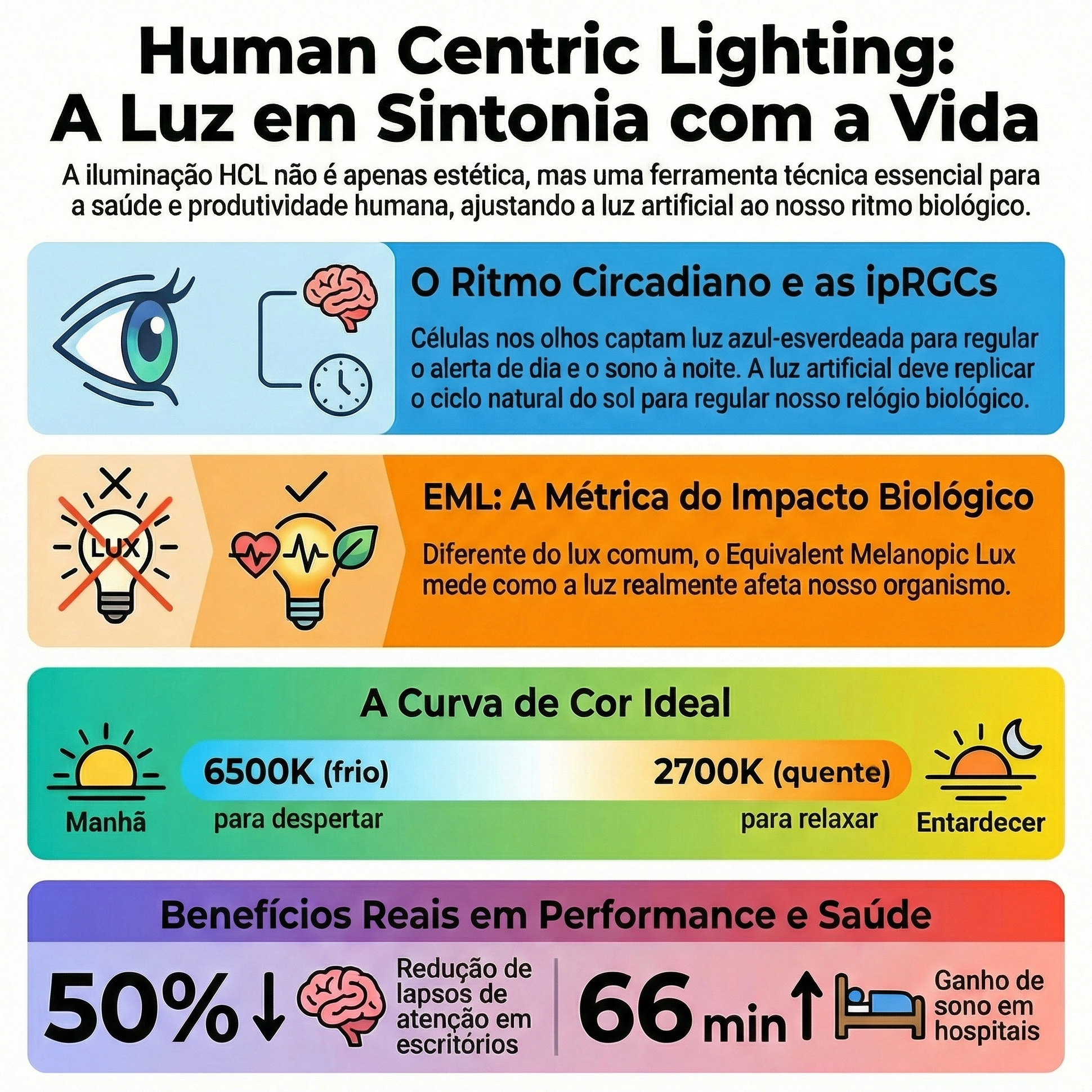 Vale destacar que a simples escolha de uma luminária LED de alta eficiência não garante resultado circadiano. O que determina o impacto biológico é a distribuição espectral de potência (SPD) de cada ponto de CCT disponível, e não apenas o CCT nominal. Por isso, conforme detalharemos adiante, a exigência do SPD ao fabricante é etapa inegociável de qualquer projeto HCL sério.