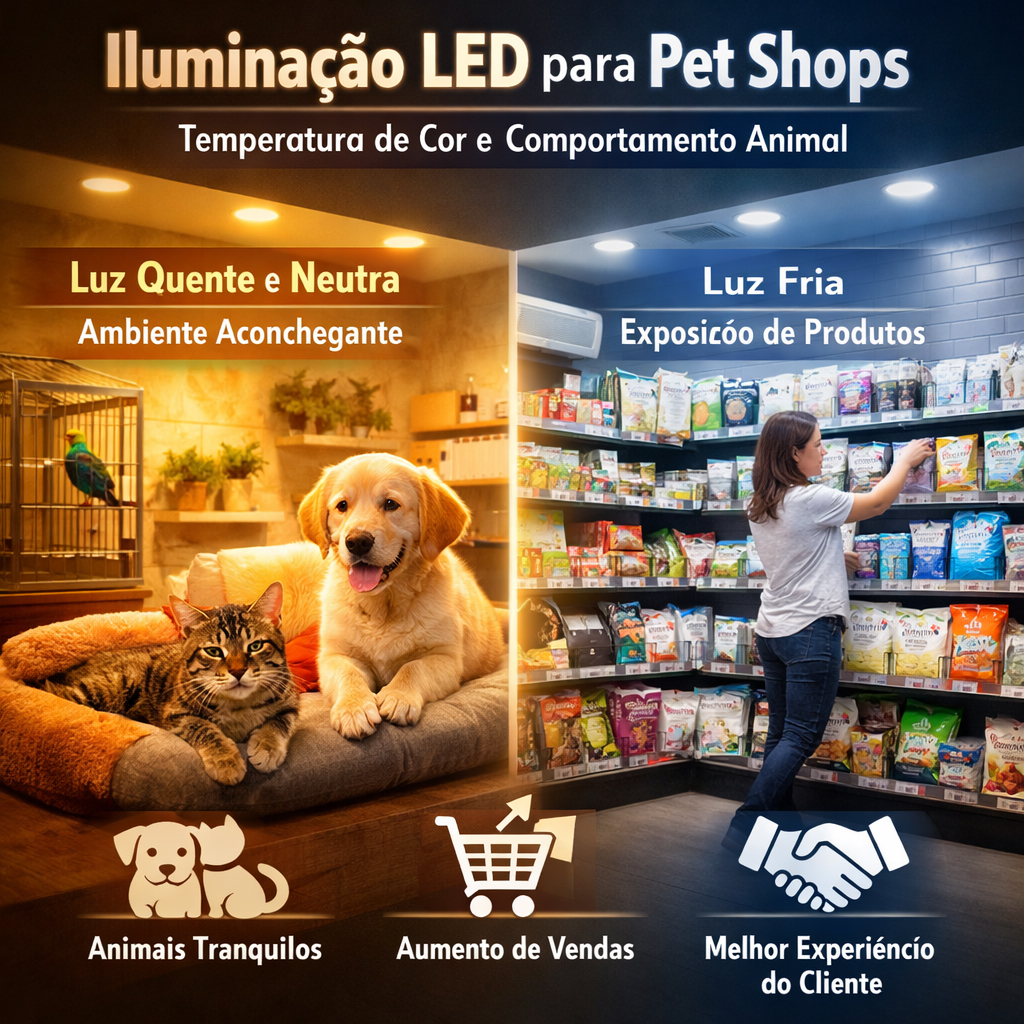 Como escolher a temperatura de cor ideal para conforto animal, melhor exposição de produtos e aumento de vendas em pet shops. Para um entendimento mais aprofundado sobre iluminação, acesse nosso Guia Completo.