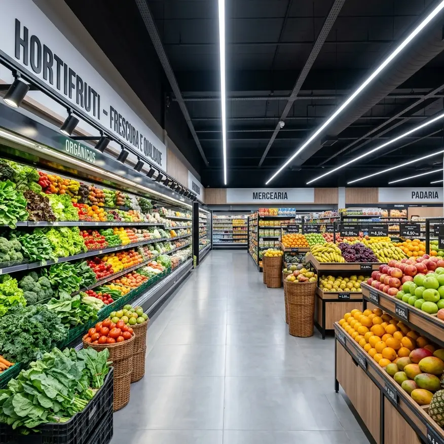 A iluminação adequada para supermercado combina iluminação geral uniforme com iluminação de destaque por setor. Recomenda-se luminárias LED com IRC acima de 90 e temperatura de cor adequada a cada área, como hortifruti, açougue e padaria.