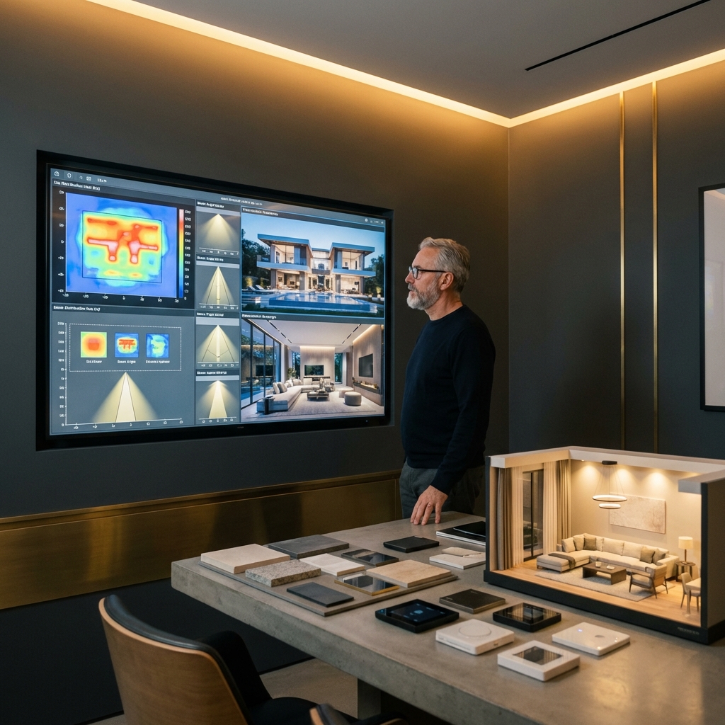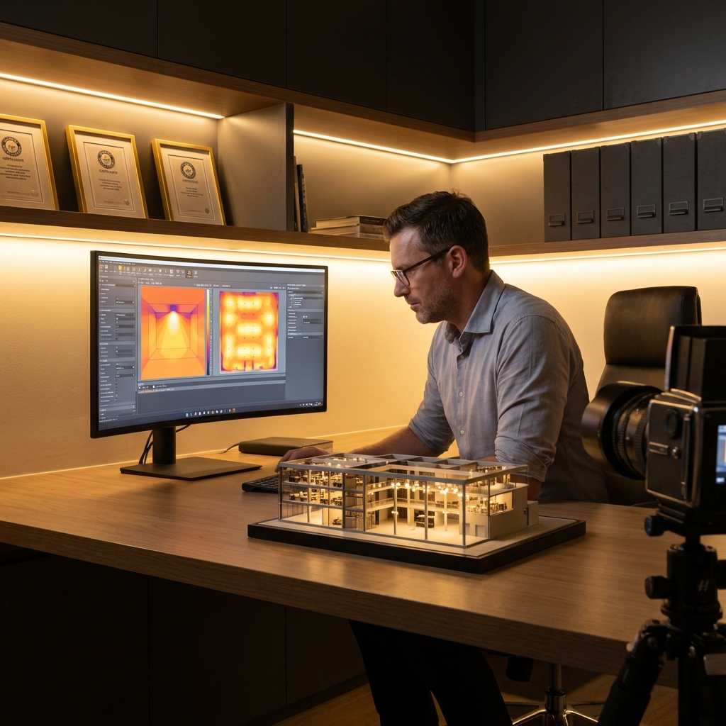Um projeto luminotécnico completo inclui o cálculo do nível de iluminância por ambiente, a simulação fotométrica com base nas curvas dos produtos selecionados, o posicionamento das luminárias em planta baixa e o memorial descritivo com especificações técnicas. Ferramentas como Dialux e Relux são utilizadas para garantir que os resultados simulados correspondam às condições reais do espaço.