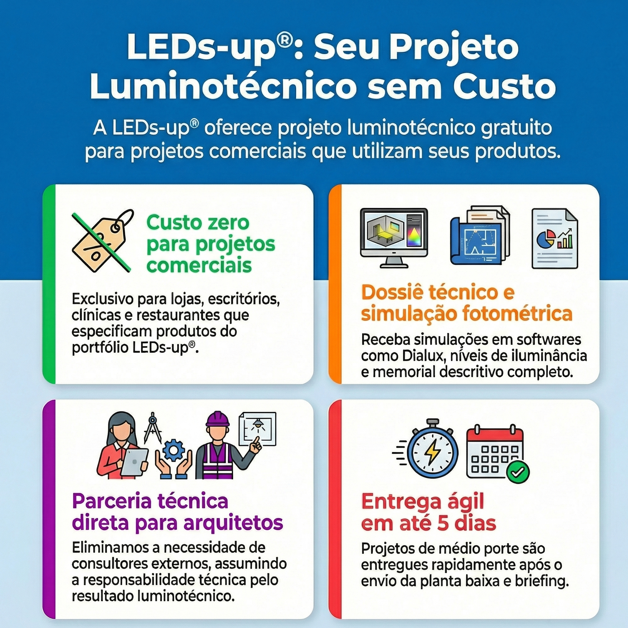 A LEDs-up oferece projeto luminotécnico sem custo para projetos comerciais que utilizem seus produtos. Isso significa que o arquiteto ou designer de interiores apresenta o briefing do projeto e recebe em troca um estudo luminotécnico desenvolvido pela equipe técnica da empresa, com simulação fotométrica e indicação dos produtos mais adequados para cada ambiente.